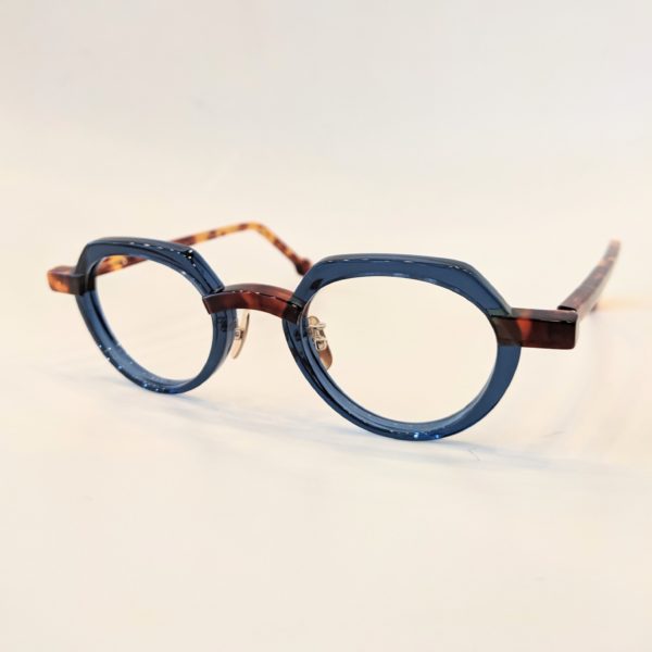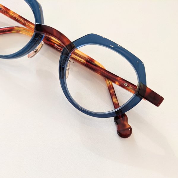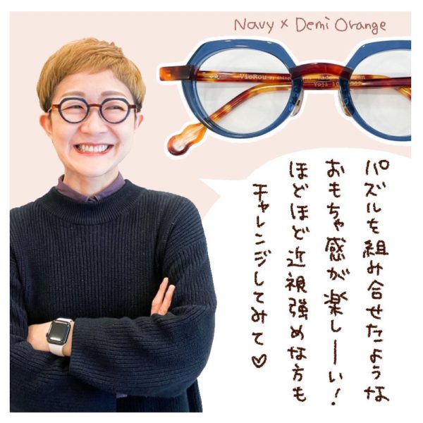 上の写真で掛けていたこちら、ネイビーとオレンジ系べっ甲カラーの組み合わせ。