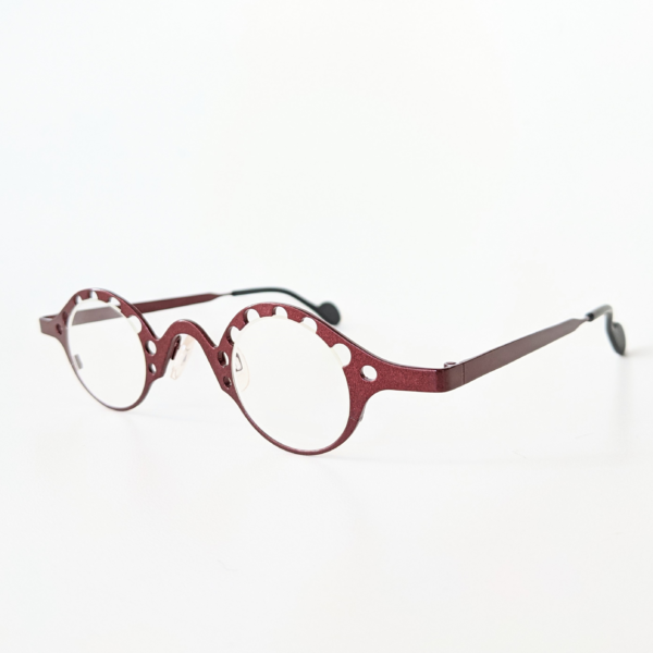 レンズの周りにくり抜きで施された水玉模様が、掛けるとまつ毛みたいに見えちゃうアイメイク風メガネ😊