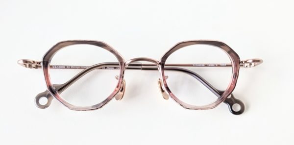 “グレーとピンクが混ざったクリア系マーブル柄”のプラスチックと、“ツヤありピンクゴールド”のメタルパーツの組み合わせ。