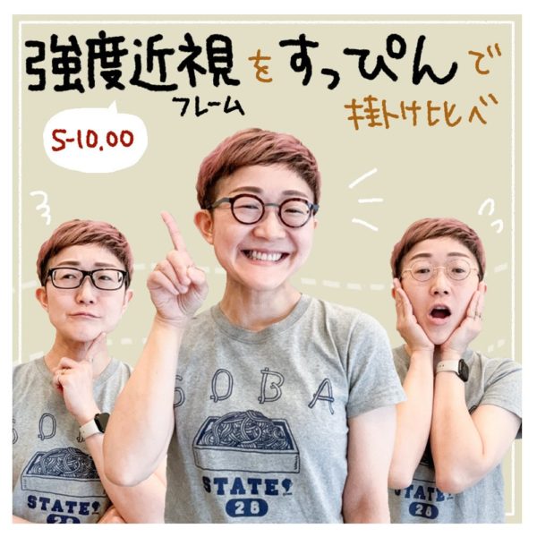 上の写真のように、左右ともに「S-10.00」という近視度数のレンズが入ったメガネを3種類用意。