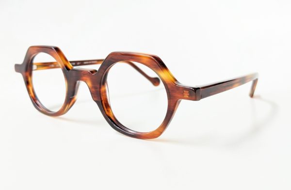 正面の全体像は六角形、でもレンズのかたちはラウンド型っていう不思議なアンバランスさがユニーク。