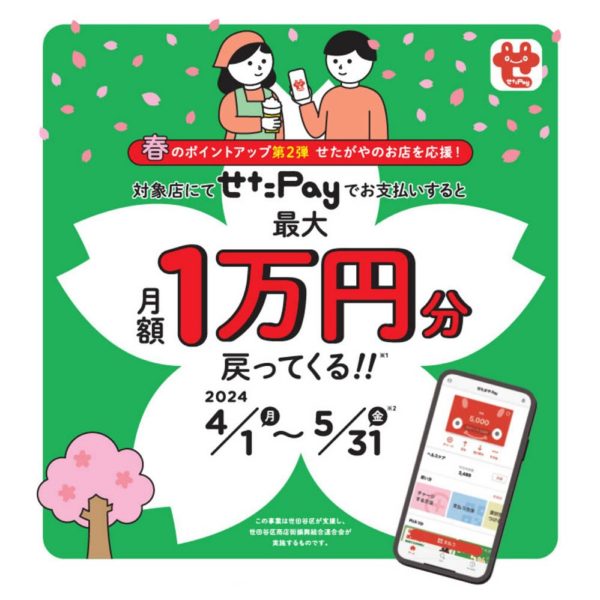 4/1から「せたがやPay(せたPay)」の、春のポイントアップキャンペーン(第2弾)が開始されます😀