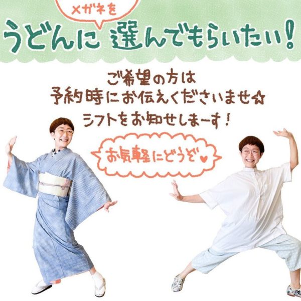 来店のご予約をしていただく際「”うどん”にメガネを選んでもらいたい」と添えて頂ければ、私のシフトをお送りしますよ~!