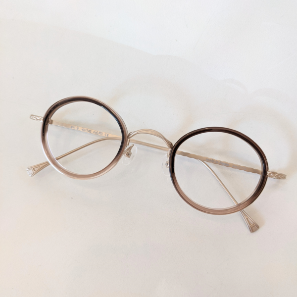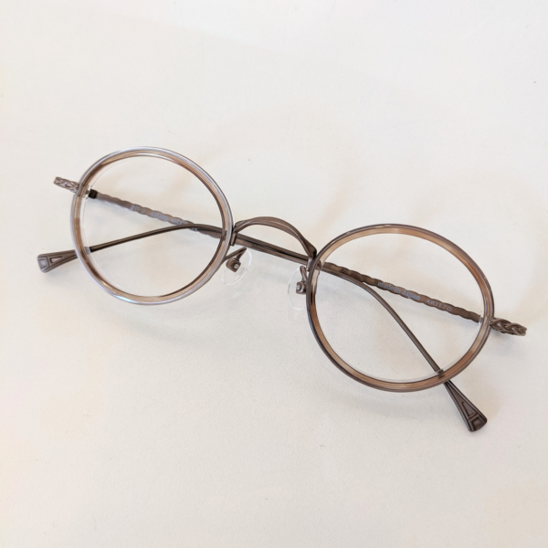 掛けるとやさしい印象になる丸メガネ。