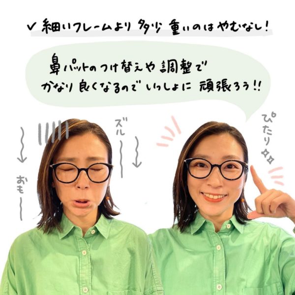 鼻のパーツの調整やテンプル(つる)の曲げ直しで解決できる事も多いので、これは店頭でどんどん聞いてください🙋♀️