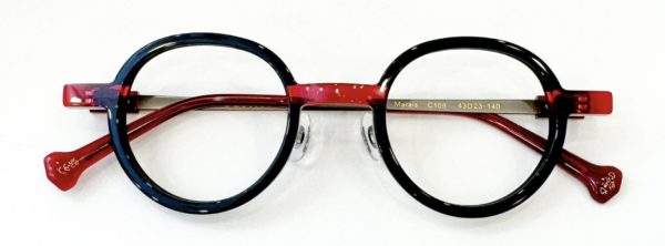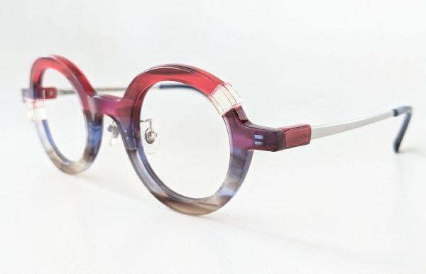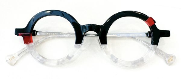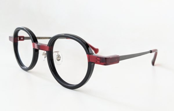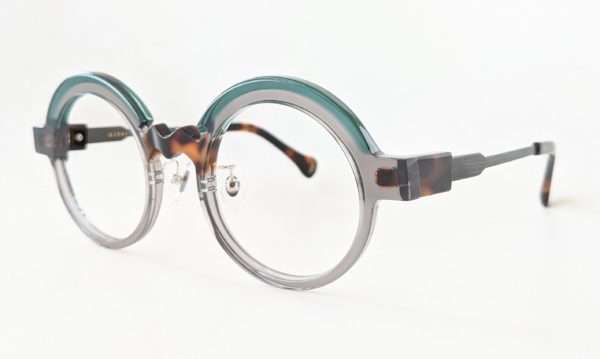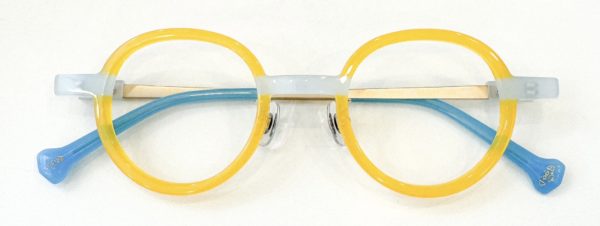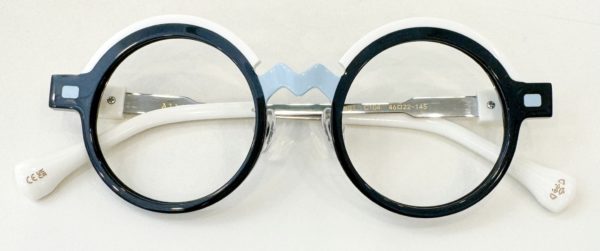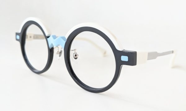 そしてこちら「Amsterdam」はフレームの左右にキューブブロックが埋め込まれたようなデザインの丸めがね。
