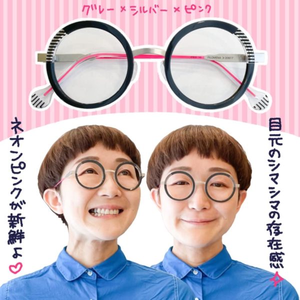 落ち着いたトーンの組み合わせかと思えば、テンプルの途中からネオンピンクに切り替わるびっくりな色使い!