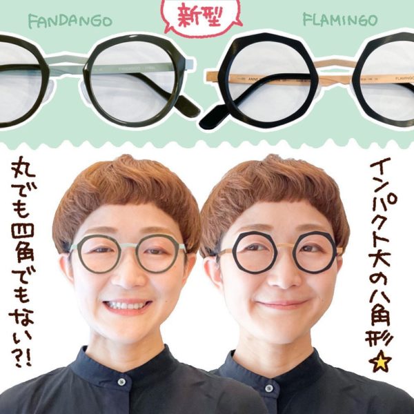 ・「FANDANGO」は上はんぶんがカクカク、下はんぶんが丸みたいなメガネ。