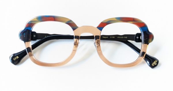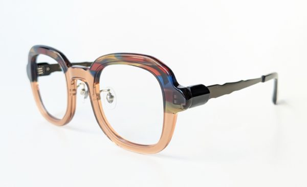 フレーム上部が虹色に彩られたブロウ風プラスチックフレーム。