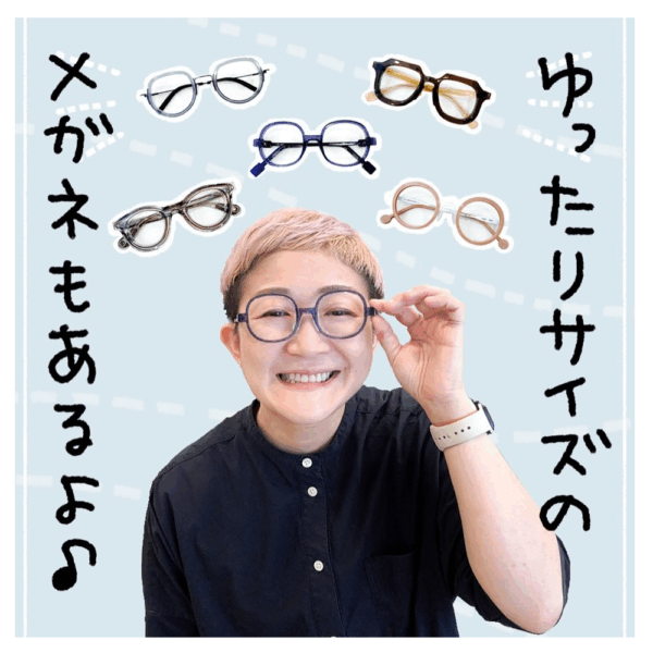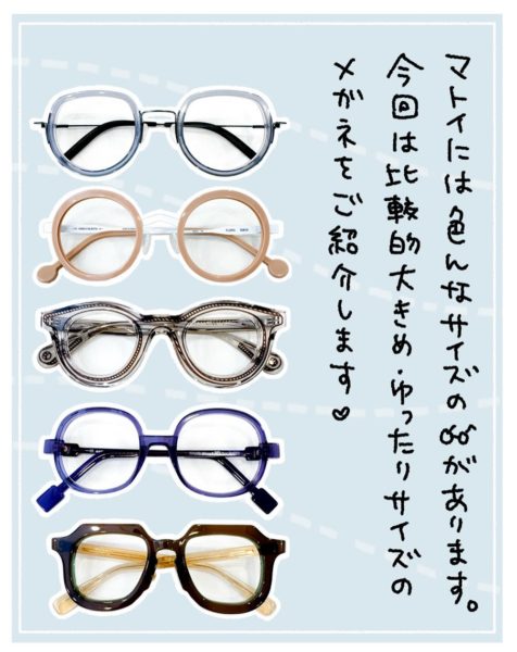 ということで、いつもがぴったりサイズの人には新鮮な印象で、普段「ふつうのメガネはちょっと窮屈で」ってお困りの方には丁度よくかけてもらえるような、ゆったりサイズのメガネ紹介でした!