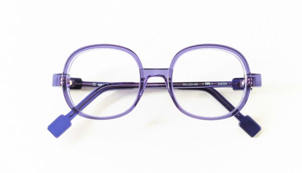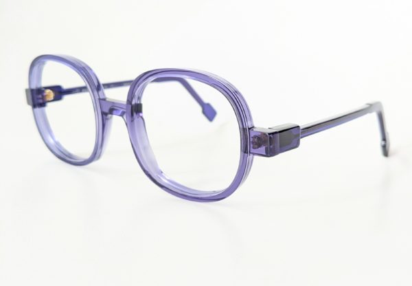 もちっとした丸っこい四角形のプラスチックフレームは、明るすぎないクリアパープルが絶妙な色づかい。