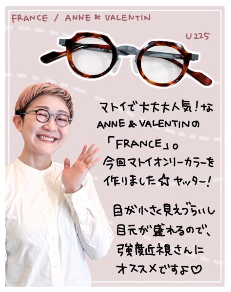マトイでずーっと大人気、特に小顔さんに好評なのがアンバレンタイン(Anne et valentin)の「FRANCE」というモデル。