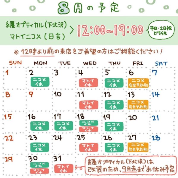 纒オプティカル&マトイニコメの8月の営業スケジュールをご案内します!