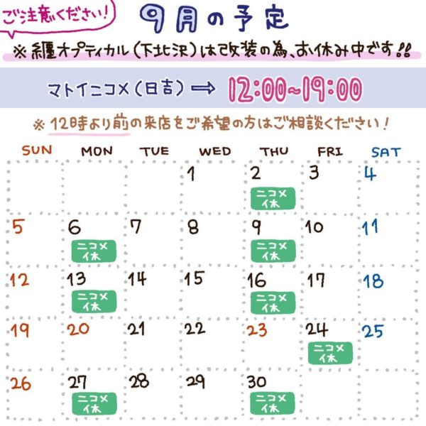纒オプティカル/マトイニコメ【9月の営業のお知らせ】